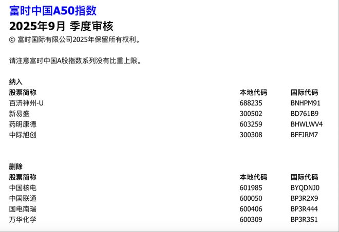 富时罗素A50调整:纳入百济神州、药明康德、新易盛、中际旭创