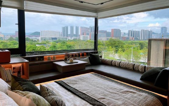 图注:越秀·星科源启89户型创意样板间卧室景观建面约112㎡四房南向采光面约12.3米,阳台和三个房间都朝南,可观赏开阔的小区园林景观。入户玄关处的房间,可作为父母的房间,做到三代人的作息互不打扰;也可以是书房,作为偶尔深夜加班或者打游戏放松的空间,不打扰其他家庭成员休息。为改善家庭提供更优的居住解决方案。