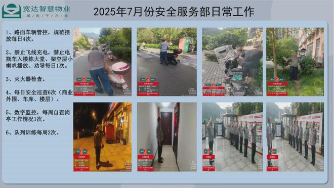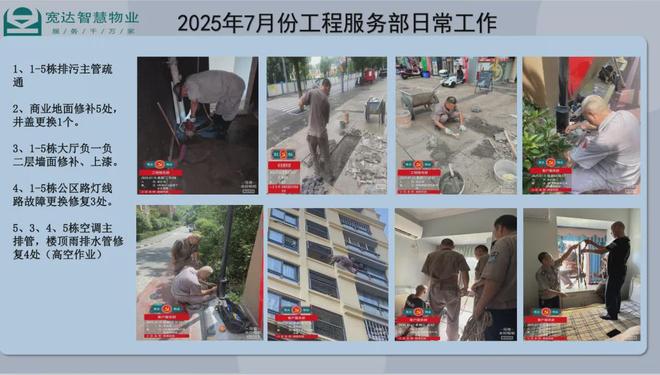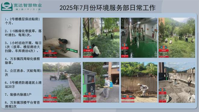 各位业主朋友,大家好!今天来给大家摆一哈上个月(2025年7月)我们为西城花园做的服务重点。作为您的“贴心管家”,我们努力让小区更温馨、更安全。上月,我们团队撸起袖子加油干,处理了很多事情,现在就来给大家汇报一哈,保证让您听得明明白白,心头暖暖和和!