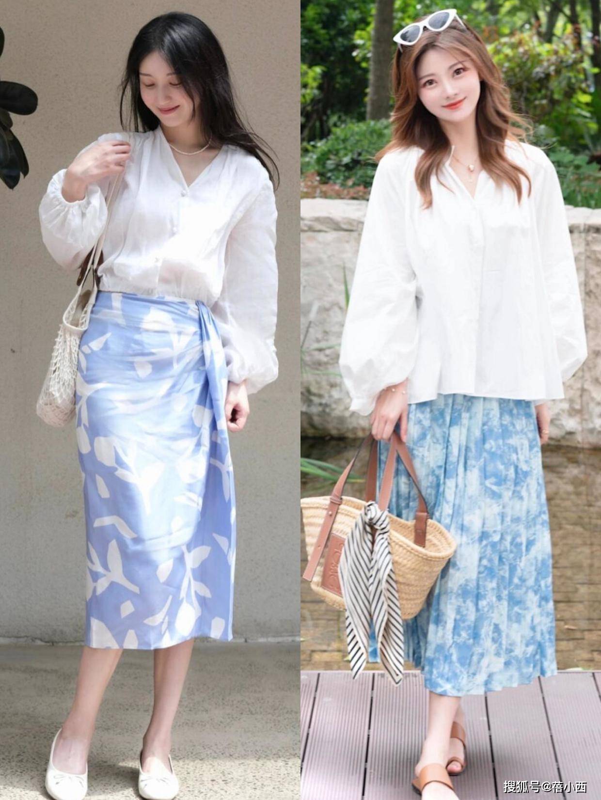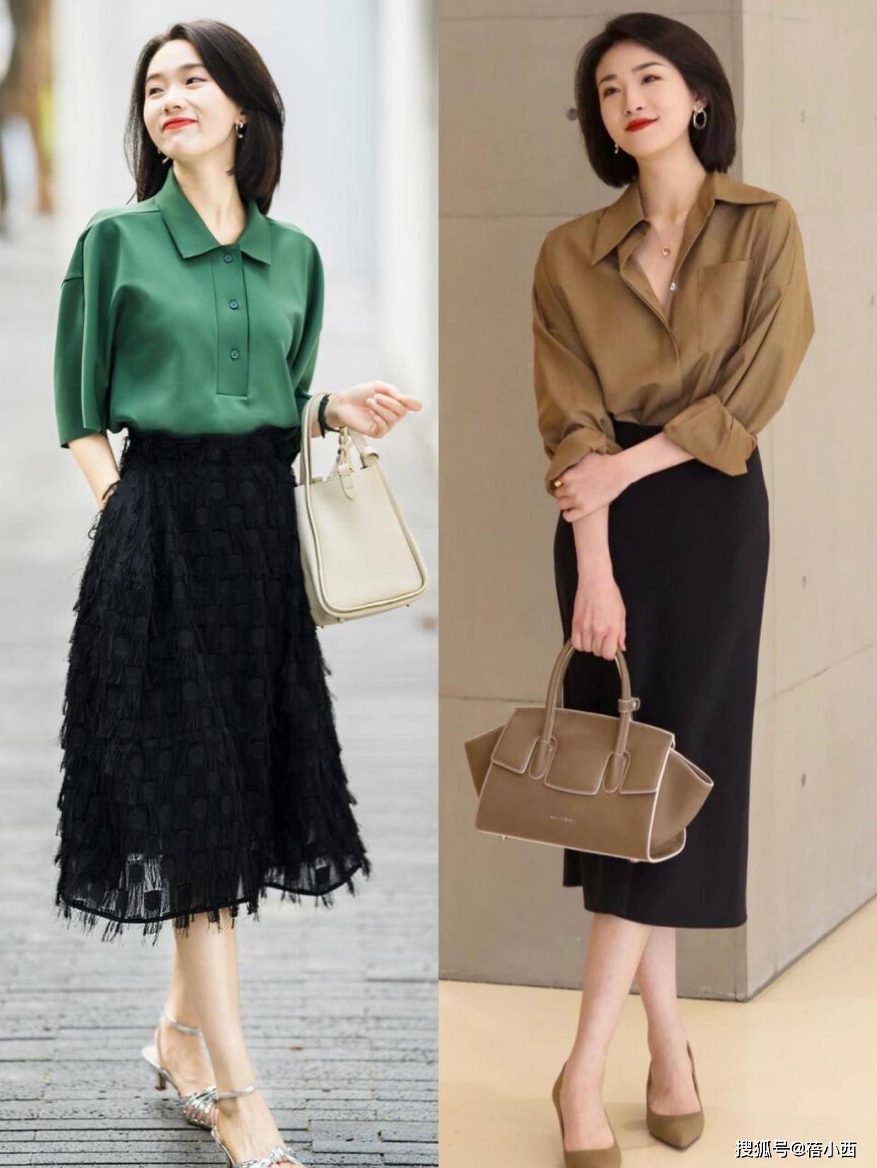衬衫与半身裙的搭配是非常优雅的选择,适合商务或正式场合。衬衫本身就有一种高贵、严谨的感觉,与半身裙搭配,不仅不会挑身材,还能增添几分职业感。尤其是黑色半身裙,经典百搭,永不过时。