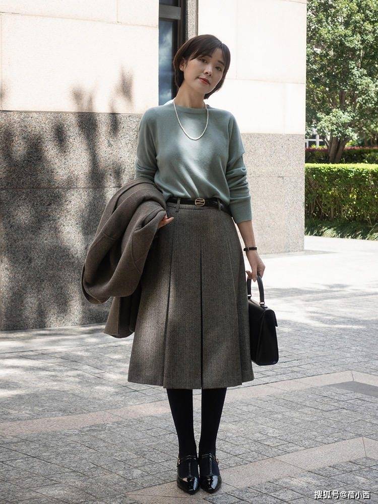 针织衫和半身裙的组合也是一种永不过时的经典搭配。简单的纯色针织衫与高腰半身裙相结合,不仅能拉长身材比例,还能展现女性柔美的气质。