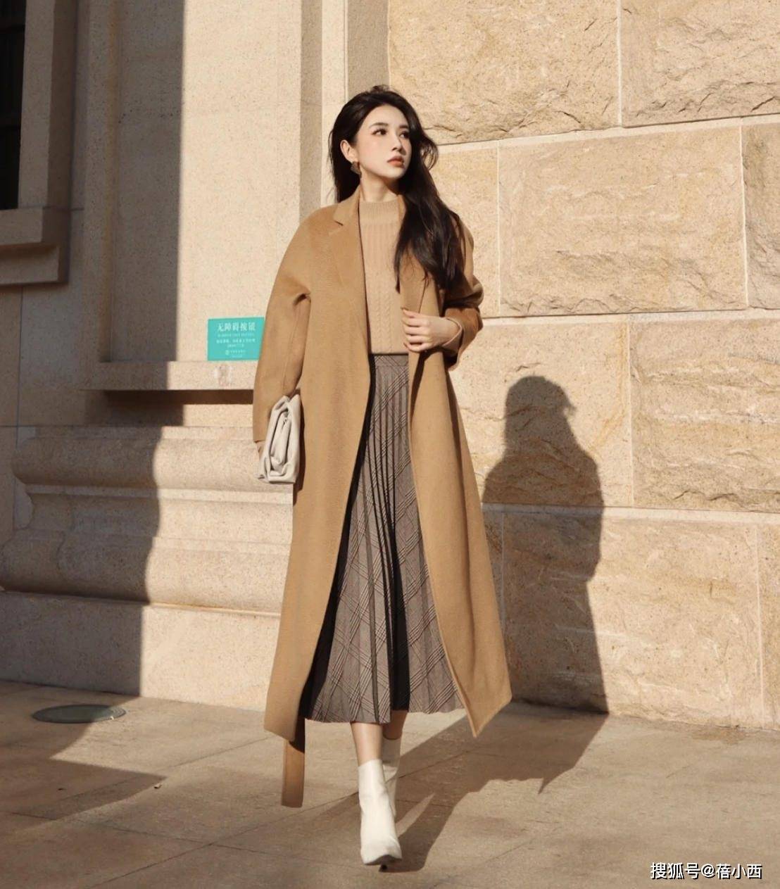 如果你喜欢复古风,可以选择酒红色毛呢外套搭配格纹半身裙,这种搭配让简约与复杂相得益彰。复古格纹的设计感十足,搭配纯色外套既不过于繁复,又能突出整体的时尚感。