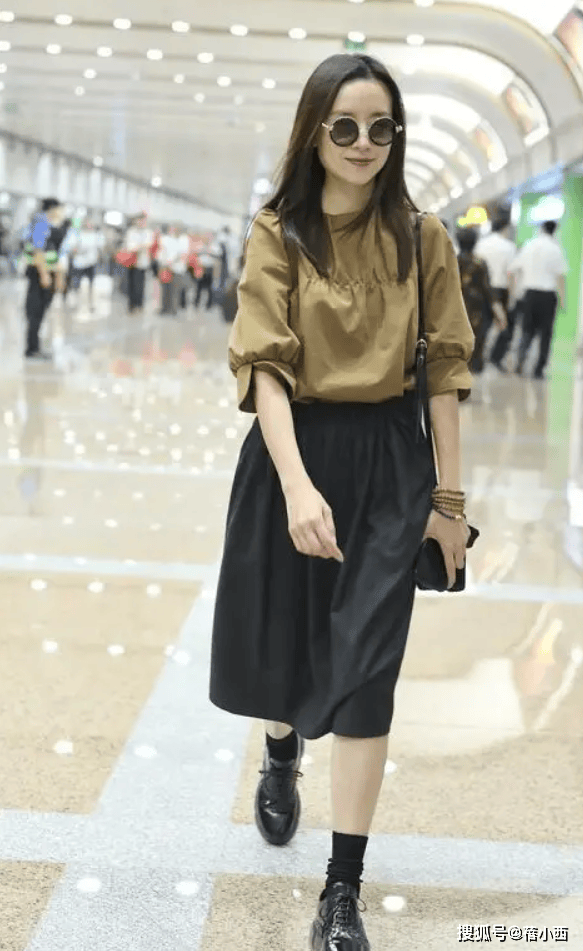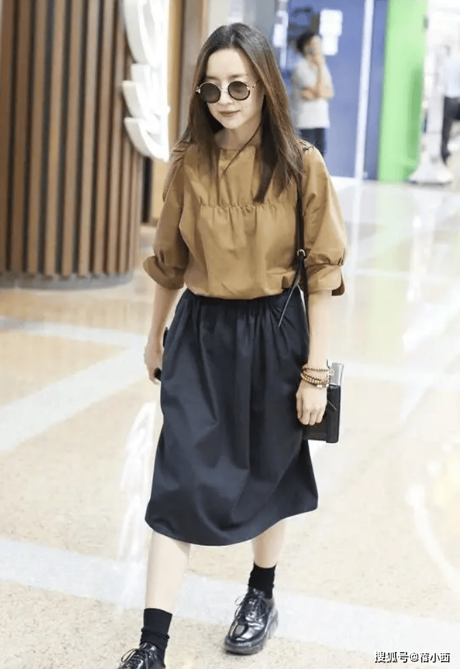 董洁向来以纤细的身材著称,体重约八十斤,整个人就像一块标准的衣架子。这次她以标志性的美拉德穿搭风格引领时尚潮流,选择棕色衬衫、黑色半身裙以及乐福鞋的组合,呈现出成熟中带着青春气息的时尚感。下面就让我们一同欣赏她的搭配要点。