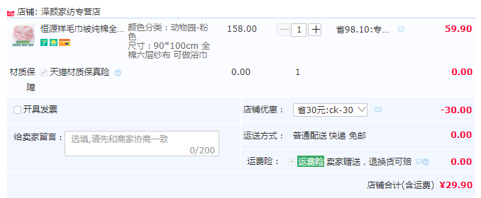 全棉六层纱布加厚工艺毛巾被夏凉被,规格:90*100cm 可当空调被,毯子,可做床单,可铺可盖,多功能使用。目前天猫商城泽颜家纺专营店售价¥59.9,可使用