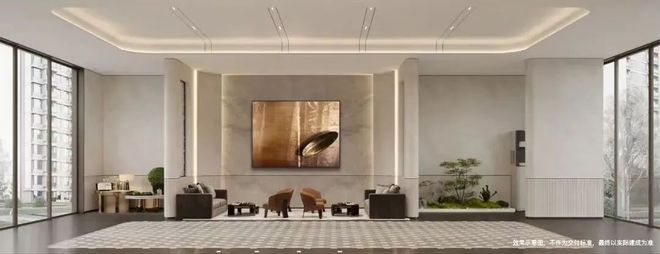 招商时代潮派售楼处电话:顶部采用香槟金色的斜角造型铝板,搭配手工打磨的星空顶及氛围灯,地面铺设仿石砖,墙面基调则借鉴了华尔道夫酒店的浅米黄色系大理石,并配以精致的礼仪灯设计。