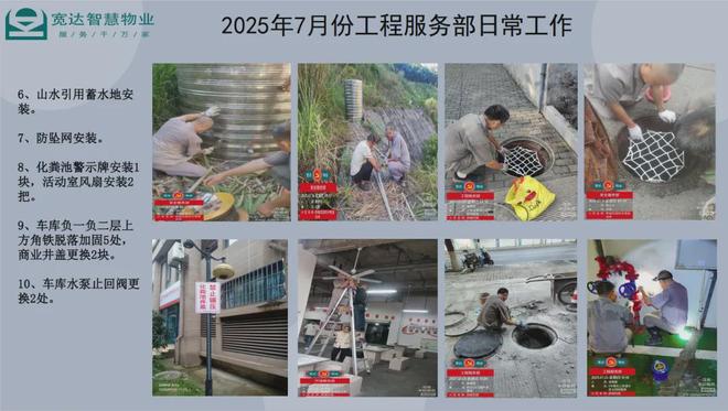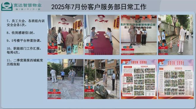 各位业主朋友,大家好!今天来给大家摆一哈上个月(2025年7月)我们为西城花园做的服务重点。作为您的“贴心管家”,我们努力让小区更温馨、更安全。上月,我们团队撸起袖子加油干,处理了很多事情,现在就来给大家汇报一哈,保证让您听得明明白白,心头暖暖和和!
