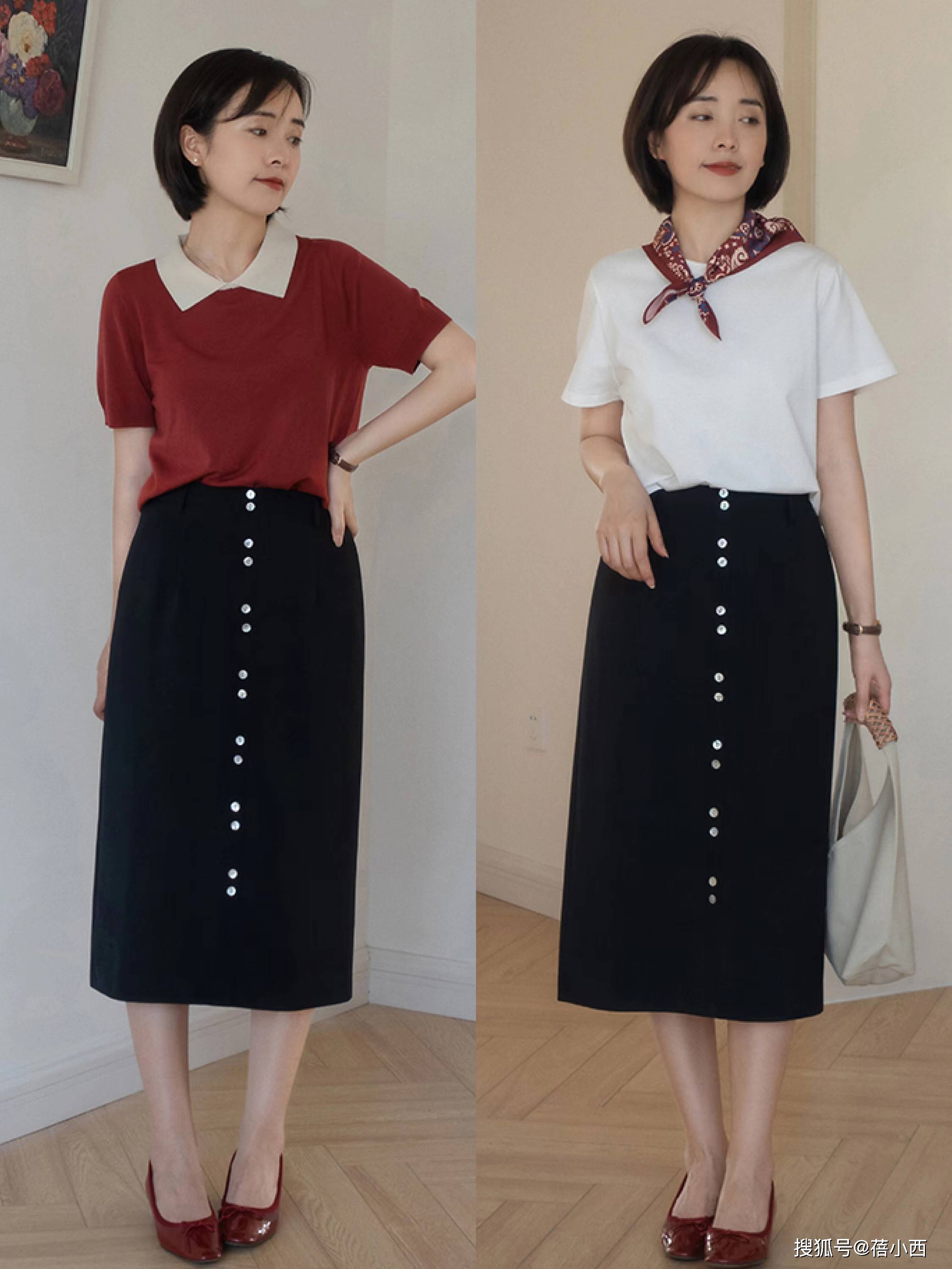 衬衫与半身裙的搭配是非常优雅的选择,适合商务或正式场合。衬衫本身就有一种高贵、严谨的感觉,与半身裙搭配,不仅不会挑身材,还能增添几分职业感。尤其是黑色半身裙,经典百搭,永不过时。
