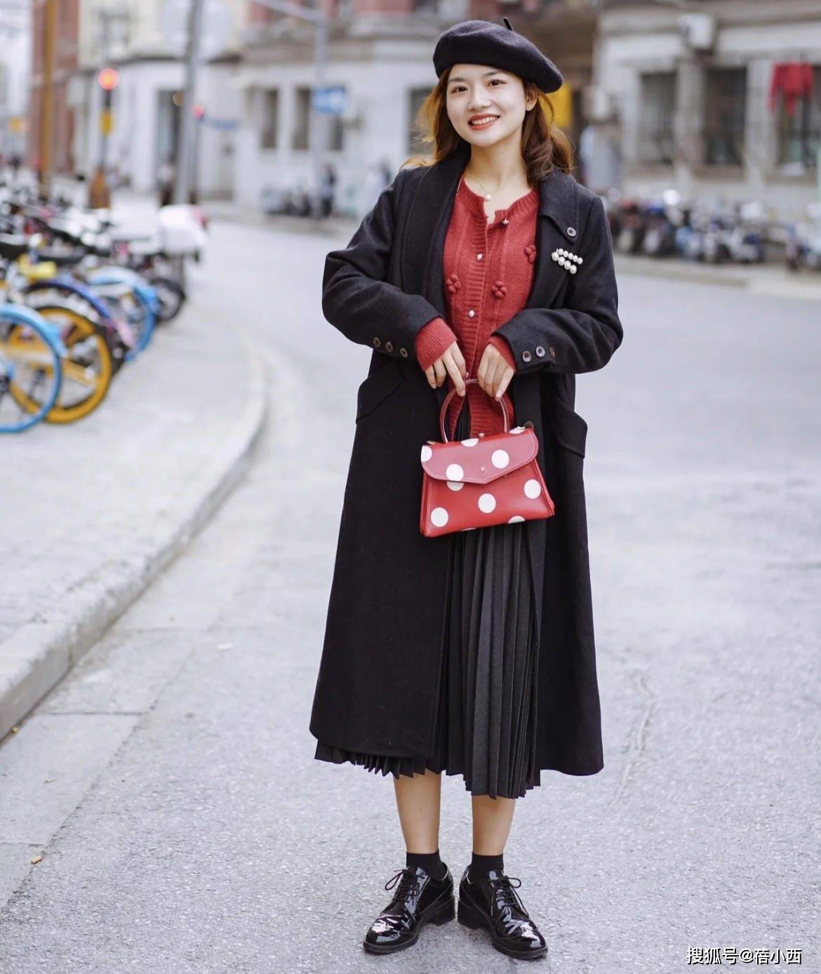如果你喜欢复古风,可以选择酒红色毛呢外套搭配格纹半身裙,这种搭配让简约与复杂相得益彰。复古格纹的设计感十足,搭配纯色外套既不过于繁复,又能突出整体的时尚感。