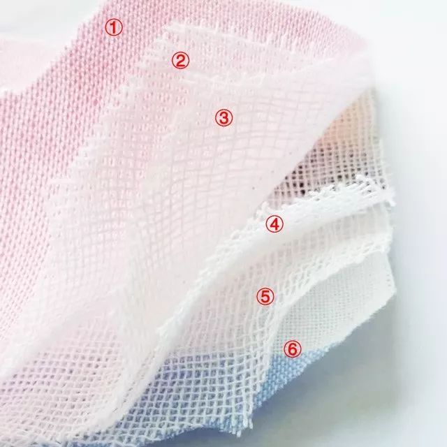 内里的4层(上图②~⑤),用的是32支的棉纱,纱线比较粗,纱布织得比较疏松、网孔很大;